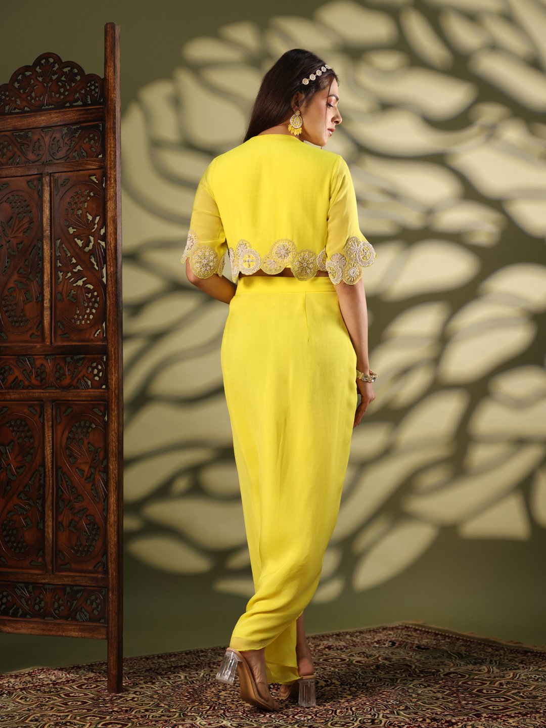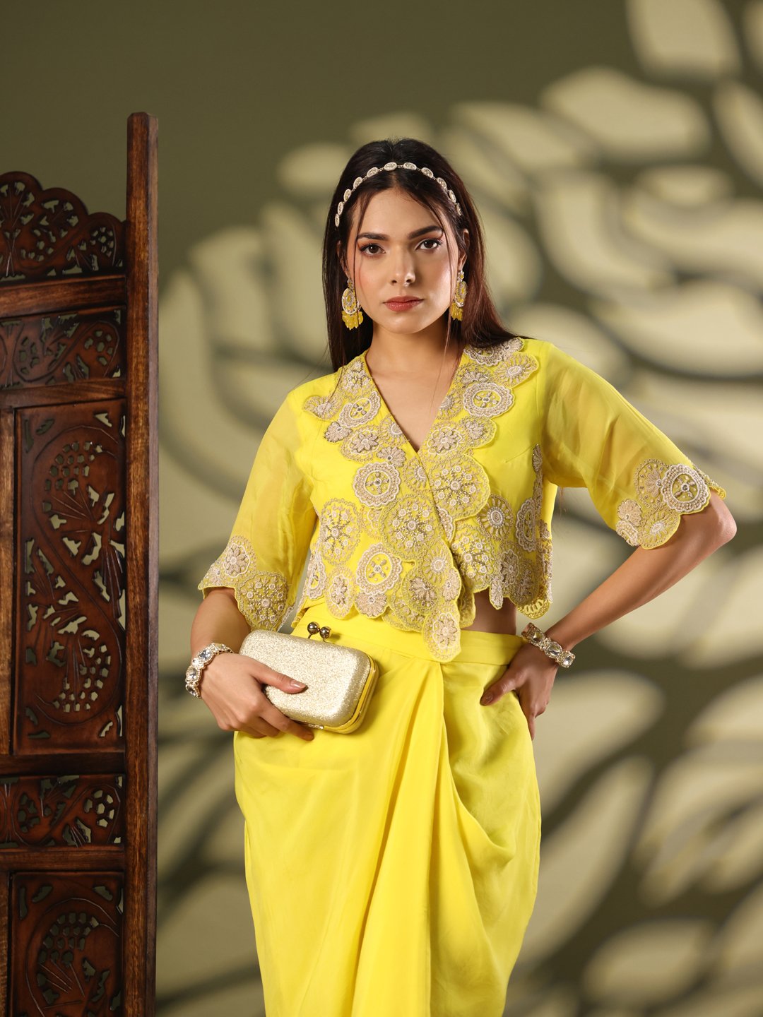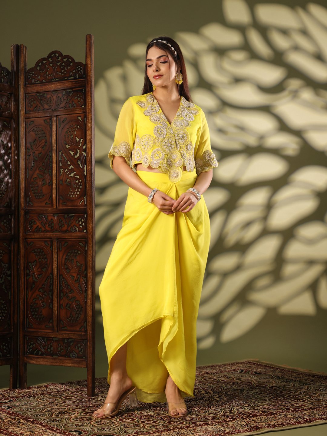 Indo-Western Drape With Dabka and Dori Work in Organza Yellow